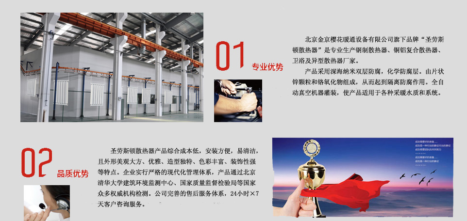 北京金京樱花暖通设备有限公司是专业生产钢制散热器、铜铝复合散热器、卫浴散热器及异型散热器的厂家。旗下品牌:“圣劳斯顿散热器”。 公司重视企业文化建设,“倡导舒适科学,感悟新的需求;不断创新产品,为客户提供优质服务”的经营理念和成功经验,为中国广大消费者提供,色彩多变,即符合“轻型高效、节能节材、美观环保”的国家供热改革的应用需求。产品采用国内最严格的企业标准,采用优质的原辅材料,保证了焊接质量的稳定性和内防腐质量的可靠性,满足国内供暖使用条件。